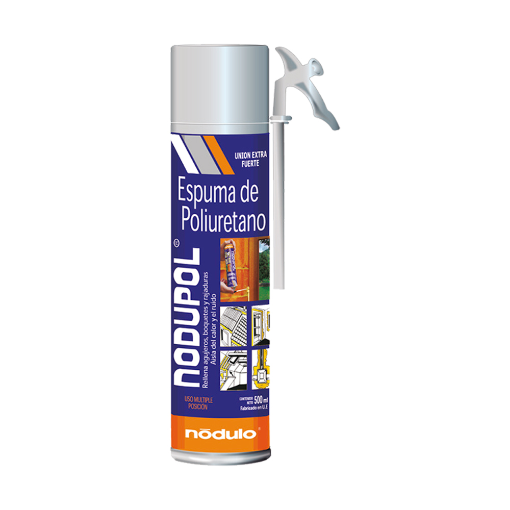 Espuma de poliuretano Nodupol 500 ml de un componente que cura por humedad ambiental y de sustrato, logrando sellos firmes y estables en marcos, pasamuros, cajas eléctricas y pasos de cañerías. Asimismo, resulta ideal para instalaciones HVAC, refrigeración ligera y fijaciones en obra, donde se necesita aislamiento térmico, relleno de holguras y reducción de vibraciones. Su aplicación en aerosol agiliza el trabajo y mejora la prolijidad del acabado.